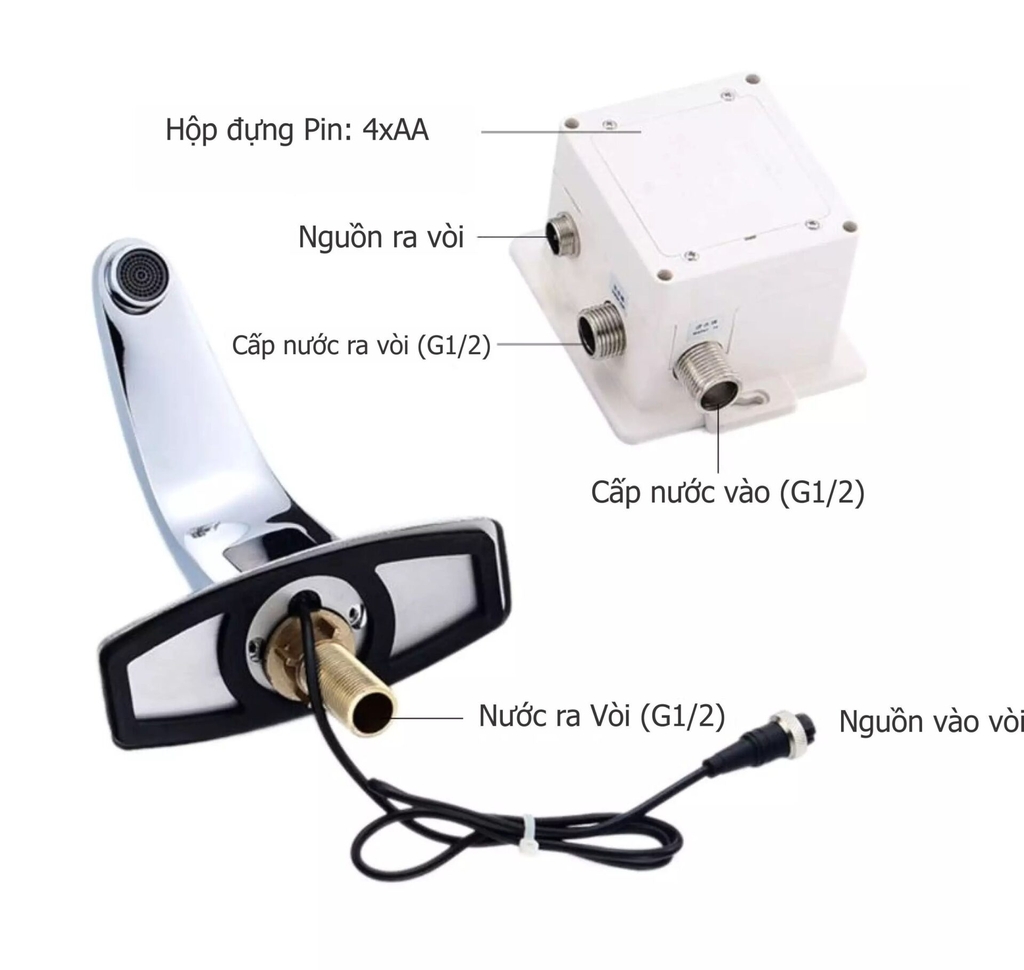 - Vòi rửa tay tự động Kawasan sử dụng pin AA x 4 cục (6VDC) hoặc nguồn điện 220V. Ưu điểm dùng pin tiện lợi, khi vòi cảm ứng mất điện vẫn có thể dùng được. Chu kỳ xả nước thông minh, trung bình có thể đạt 100 lần xả/ ngày. Phương án mới giúp tiết kiệm điện và nước hiệu quả cho các khu vực nhà vệ sinh có lavabo.